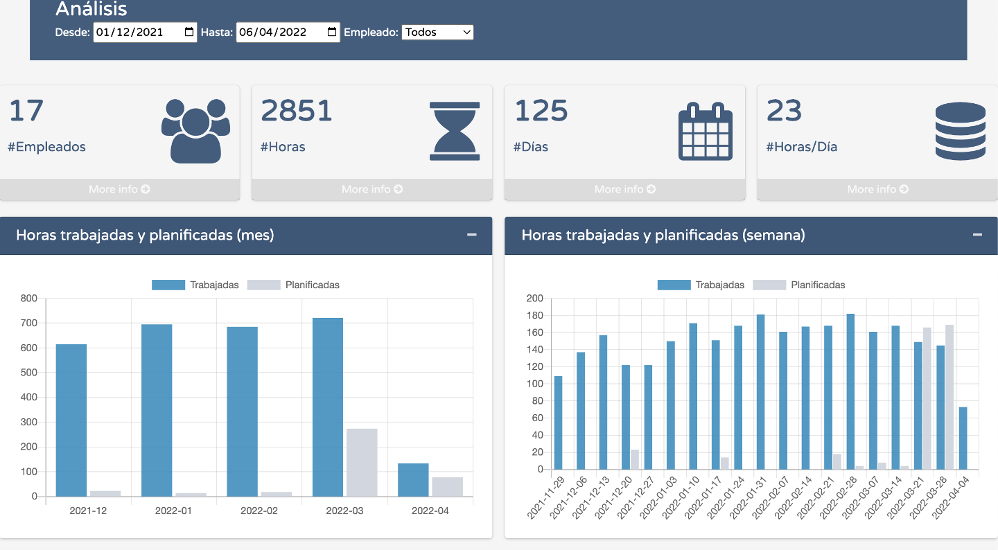 Controla horas planificadas, trabajadas, días, promedios por servicio, por semana, por mes, en el intervalo que elijas.